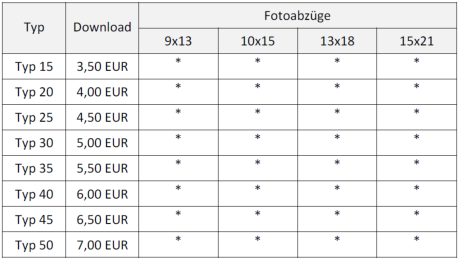 PreislisteDer Preis für die einzelnen Serien richtet sich nach dem Serien-Typ, der immer zusammen mit der Seriennummer angegeben ist.Einführungspreise bis 28.2.2011:Die angebenen Preise verstehen sich inkl. Mwst. und (bei den Abzügen) inkl. Versand.Auf Wunsch kann ich Ihnen eine Rechnung/Quittung ausstellen.Die Fotoabzüge werden nach Ihrer Bezahlung von mir bei Fotokasten bestellt und Ihnenvon dort direkt zugeschickt. Als Qualitätsstufe wird grundsätzlich “Standard” gewählt.Falls das Seitenverhältnis der Vorlage nicht mit dem Seitenverhältnis der Abzügeidentisch ist, wird das Foto nicht beschnitten, sondern es verbleibt ein weißer Streifenauf dem Abzug. Andere Formate oder Qualitätsstufen erhalten Sie auf Anfrage. * Fotoabzüge kann ich Ihnen ab Mitte Dezember anbieten. Die Preise stehen noch nicht fest.